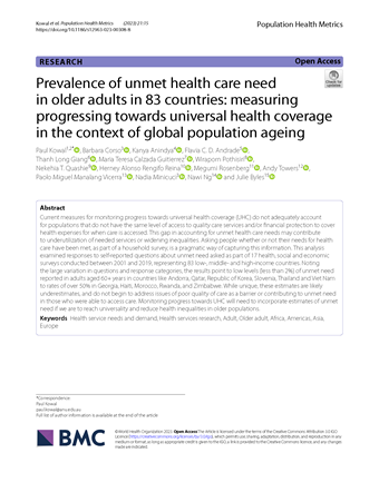 Prevalence of unmet health care need in older adults in 83 countries: measuring progressing towards universal...